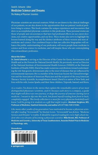 "It is a rare gift to benefit from the collective wisdom of so many individuals at the same time. These physician scientists have provided readers with helpful advice and thoughtful encouragement. The interesting and thought provoking essays in Medicine Science and Dreams can be read and digested one at a time or all at once in sequence. They provide lessons to be learned by any physician-scientist, whether just starting out or in the middle of a research career. Schwartz has done readers a great service and has added to the legacy of these prominent and successful physician-scientists." Book review in JAMA, September 7, 2011-Vol 306, No. 9 by Derek S. Wheeler, MD