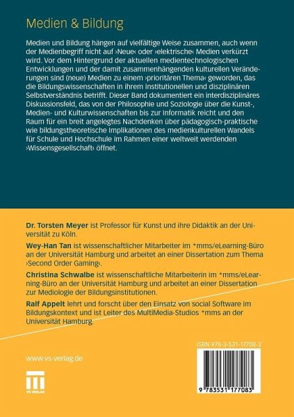 Dr. Torsten Meyer ist Professor für Kunst und ihre Didaktik an der Universität zu Köln. Wey-Han Tan ist wissenschaftlicher Mitarbeiter im *mms/eLearning-Büro an der Universität Hamburg und arbeitet an einer Dissertation zum Thema ¿Second Order Gaming¿. Christina Schwalbe ist wissenschaftliche Mitarbeiterin im *mms/eLearning-Büro an der Universität Hamburg und arbeitet an einer Dissertation zur Mediologie der Bildungsinstitutionen. Ralf Appelt lehrt und forscht über den Einsatz von social Software im Bildungskontext und ist Leiter des MultiMedia-Studios *mms an der Universität Hamburg.