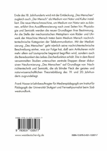 Ende des 18. Jahrhunderts wird mit der Entdeckung Des Menschen zugleich auch Der Mensch als Medium von Natur und Kultur installiert. Die neue Menschmaschine, um Medium von Natur sein zu können, erfährt ihre Ausdifferenzierung nach zwei Seiten hin: Physiologie und Semiotik werden die neuen Grundlagen ihrer Bestimmung. An die Stelle der mechanistischen Metaphern vom Räder- und Uhrwerk der Maschine Mensch treten beim Medium Mensch nachrichtentechnische Kategorien der Telekommunikation. Mit der Mediatisierung Des Menschen geht nämlich seine nachrichtentechnische Beschreibung einher, was zur Folge hat, daß sein Artikulieren nicht mehr allein auf Lautsprache begrenzt begriffen wird, sondern auch die Beredsamkeit des Leibes Zeichenfunktion erhält. Die in dem Band versammelten Studien untersuchen zentrale Etappen dieser diskursiven Neuformierung Des Menschen auf Grundlage von Nachrichtentechnik und Semiotik, die als blinder Fleck der geistes- und naturwissenschaftlichen Theoriebildung des 19. und 20. Jahrhunderts zugrundeliegt.