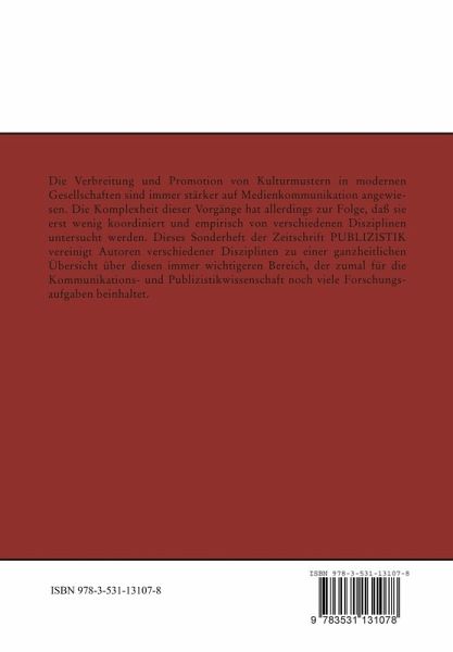 Die Verbreitung und Promotion von Kulturmustern in modernen Gesellschaften sind immer stärker auf Medienkommunikation angewiesen. Die Komplexheit dieser Vorgänge hat allerdings zur Folge, daß sie erst wenig koordiniert und empirisch von verschiedenen Disziplinen untersucht werden. Dieses Sonderheft der Zeitschrift 'Publizistik' vereinigt Autoren verschiedener Disziplinen zu einer ganzheitlichen Übersicht über diesen immer wichtigeren Bereich, der zumal für die Kommunikations- und Publizistikwissenschaft noch viele Forschungsaufgaben beinhaltet.