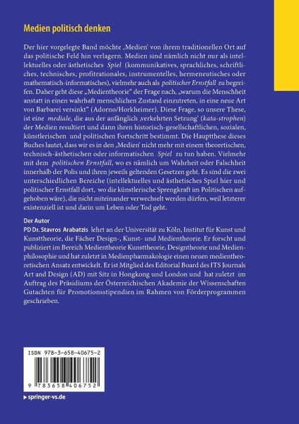 Der hier vorgelegte Band möchte 'Medien von ihrem traditionellen Ort auf das politische Feld hin verlagern. Medien sind nämlich nicht nur als intellektuelles oder ästhetisches Spiel (kommunikatives, sprachliches, schriftliches, technisches, profitrationales, instrumentelles, hermeneutisches oder mathematisch-informatisches), vielmehr auch als politischer Ernstfall zu begreifen. Daher geht diese "Medientheorie der Frage nach, "warum die Menschheit anstatt in einen wahrhaft menschlichen Zustand einzutreten, in eine neue Art von Barbarei versinkt (Adorno/Horkheimer). Diese Frage, so unsere These, ist eine mediale, die aus der anfänglich 'verkehrten Setzung (kata-strophen) der Medien resultiert und dann ihren historisch-gesellschaftlichen, sozialen und politischen Fortschritt bestimmt. Die Hauptthese dieses Buches lautet, dass wir es in den 'Medien nicht mehr mit einem theoretischen, technisch-ästhetischen oder informatischen Spiel zu tun haben. Vielmehr mit dem politischen Ernstfall, wo es nämlich um Wahrheit oder Falschheit innerhalb der Polis und ihren jeweils geltenden Gesetzen geht. Es sind die zwei unterschiedlichen Bereiche (intellektuelles und ästhetisches Spiel hier und politischer Ernstfall dort), die nicht miteinander verwechselt werden dürfen, weil letzterer existenziell ist und darin um Leben oder Tod geht.