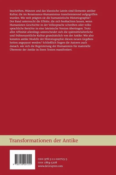 Inschriften, Münzen, literarische Modelle und das klassische Latein sind Elemente antiker Kultur, die im Renaissance-Humanismus transformierend aufgegriffen wurden. Wie weit prägten sie dabei die humanistische Historiografie? Der Band, der die Ergebnisse einer wissenschaftlichen Tagung des Berliner Sonderforschungsbereichs "Transformationen der Antike" zusammenfasst, diskutiert diese Frage: Er untersucht einerseits die Effekte, die sich beobachten lassen, wenn Humanisten Geschichtsschreibung in einer modernen Sprache verfassen oder volkssprachliche Berichte in eine lateinische Version übertragen. Da sich die spätmittelalterliche und frühneuzeitliche Kultur grundsätzlich von derjenigen des Altertums unterschied, richtet sich ein zweiter Schwerpunkt der Beiträge auf das Problem, wie die antiken historiografischen Modelle von den humanistischen Gelehrten den Gegebenheiten des 15. und 16. Jahrhunderts angepasst wurden. Schließlich fragen die Autoren auch danach, wie sich die Begeisterung der Humanisten für antike Überreste nach dem Medienwechsel in die Textualität in den historischen Darstellungen manifestierte.