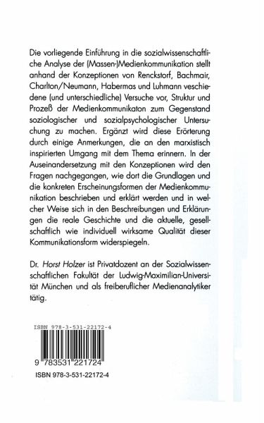 Diese Einführung in die sozialwissenschaftliche Analyse der (Massen-)Medienkommunikation stellt anhand der Konzeptionen von Renckstorf, Bachmair, Charlton/Neumann, Habermas und Luhmann verschiedene (und unterschiedliche) Versuche vor, Struktur und Prozeß der Massenkommunikation zum Gegenstand soziologischer und sozialpsychologischer Untersuchung zu machen. Ergänzt wird diese Erörterung durch einige Anmerkungen, die an den marxistisch inspirierten Umgang mit dem Thema erinnern. In der Auseinandersetzung mit den Konzeptionen wird der Frage nachgegangen, wie dort die Grundlagen und die konkreten Erscheinungsformen der Medienkommunikation beschrieben und erklärt werden und in welcher Weise sich in den Beschreibungen und Erklärungen die reale Geschichte und die aktuelle, gesellschaftlich wie individuell wirksame Qualität dieser Kommunikationsform widerspiegeln.
