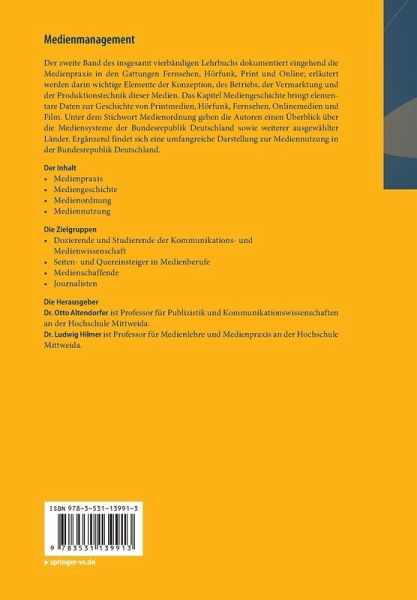 Der zweite Band des insgesamt vierbändigen Lehrbuchs dokumentiert eingehend die Medienpraxis in den Gattungen Fernsehen, Hörfunk, Print und Online; erläutert werden darin wichtige Elemente der Konzeption, des Betriebs, der Vermarktung und der Produktionstechnik dieser Medien. Das Kapitel Mediengeschichte bringt elementare Daten zur Geschichte von Printmedien, Hörfunk, Fernsehen, Onlinemedien und Film. Unter dem Stichwort Medienordnung geben die Autoren einen Überblick über die Mediensysteme der Bundesrepublik Deutschland sowie weiterer ausgewählter Länder. Ergänzend findet sich eine umfangreiche Darstellung zur Mediennutzung in der Bundesrepublik Deutschland.