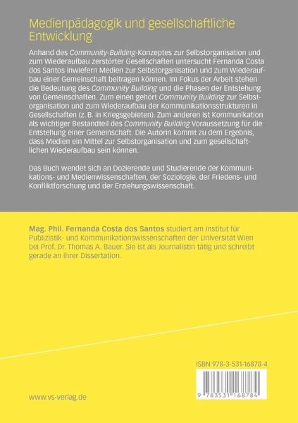 Anhand des Community-Building-Konzeptes zur Selbstorganisation und zum Wiederaufbau zerstörter Gesellschaften untersucht Fernanda Costa dos Santos, inwiefern Medien zur Selbstorganisation und zum Wiederaufbau einer Gemeinschaft beitragen können. Im Fokus der Arbeit stehen die Bedeutung des Community Building und die Phasen der Entstehung von Gemeinschaften. Zum einen gehört Community Building zur Selbstorganisation und zum Wiederaufbau der Kommunikationsstrukturen in Gesellschaften (z.B. in Kriegsgebieten). Zum anderen ist Kommunikation als wichtiger Bestandteil des Community Building Voraussetzung für die Entstehung einer Gemeinschaft. Die Autorin kommt zu dem Ergebnis, dass Medien ein Mittel zur Selbstorganisation und zum gesellschaftlichen Wiederaufbau sein können. Das Buch wendet sich an Dozierende und Studierende der Kommunikations- und Medienwissenschaften, der Soziologie, der Friedens- und Konfliktforschung und der Erziehungswissenschaft.