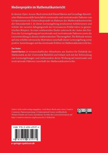 Daniel Barton entwickelt auf Grundlage theoretischer Rahmenmodelle hinsichtlich emotionaler und motivationaler Faktoren von Lernprozessen ein Unterrichtsprojekt im Rahmen des Mathematikunterrichts der Sekundarstufe I. In dieser Lernumgebung produzieren Schülerinnen und Schüler der neunten Jahrgangsstufe des Gymnasiums Erklärvideos zu geometrischen Körpern. In einer umfassenden Studie untersucht der Autor den Einfluss der Lernumgebung auf emotionale und motivationale Faktoren sowie die Lernentwicklung in diesem mathematischen Themengebiet. Die Befunde weisen auf eine erhöhtes intrinsische Motivation innerhalb dieser Lernumgebung sowie positive Auswirkungen auf das emotionale Erleben im Mathematikunterricht hin.