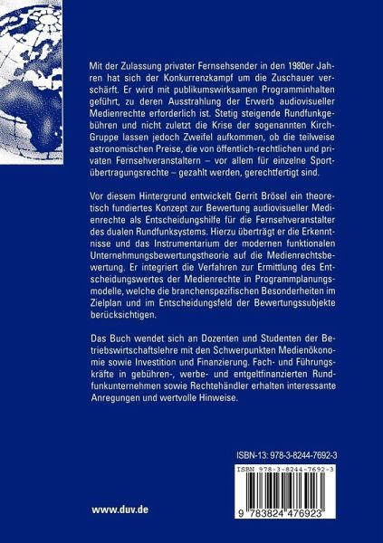 Vor diesem Hintergrund entwickelt Gerrit Brösel ein theoretisch fundiertes Konzept zur Bewertung audiovisueller Medienrechte als Entscheidungshilfe für die Fernsehveranstalter des dualen Rundfunksystems. Hierzu überträgt er die Erkenntnisse und das Instrumentarium der modernen funktionalen Unternehmungsbewertungstheorie auf die Medienrechtsbewertung. Er integriert die Verfahren zur Ermittlung des Entscheidungswertes der Medienrechte in Programmplanungsmodelle, welche die branchenspezifischen Besonderheiten im Zielplan und im Entscheidungsfeld der Bewertungssubjekte berücksichtigen.