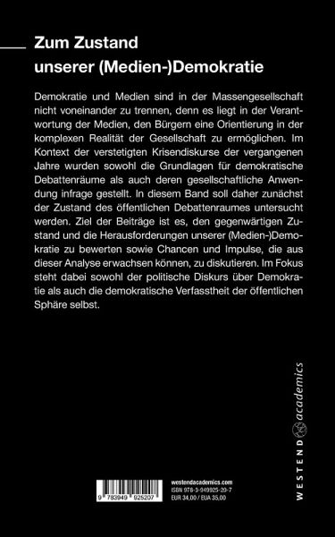 Demokratie und Medien sind in der Massengesellschaft nicht voneinander zu trennen, denn es liegt in der Verantwortung der Medien, den Bürgern eine Orientierung in der komplexen Realität der Gesellschaft zu ermöglichen. Im Kontext der verstetigten Krisendiskurse der vergangenen Jahre wurden sowohl die Grundlagen für demokratische Debattenräume als auch deren gesellschaftliche Anwendung infrage gestellt. In diesem Band soll daher zunächst der Zustand des öffentlichen Debattenraumes untersucht werden. Ziel der Beiträge ist es, den gegenwärtigen Zustand und die Herausforderungen unserer (Medien-)Demokratie zu bewerten sowie Chancen und Impulse, die aus dieser Analyse erwachsen können, zu diskutieren. Im Fokus steht dabei sowohl der politische Diskurs über Demokratie als auch die demokratische Verfasstheit der öffentlichen Sphäre selbst.