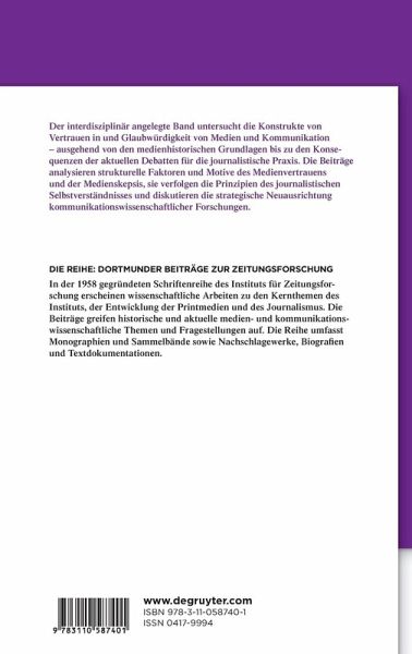 Der interdisziplinär angelegte Band untersucht die Konstrukte von Vertrauen in und Glaubwürdigkeit von Medien und Kommunikation - ausgehend von den medienhistorischen Grundlagen bis zu den Konsequenzen der aktuellen Debatten für die journalistische Praxis. Die Beiträge analysieren strukturelle Faktoren und Motive des Medienvertrauens und der Medienskepsis, sie verfolgen die Prinzipien des journalistischen Selbstverständnisses und diskutieren die strategische Neuausrichtung kommunikationswissenschaftlicher Forschungen.