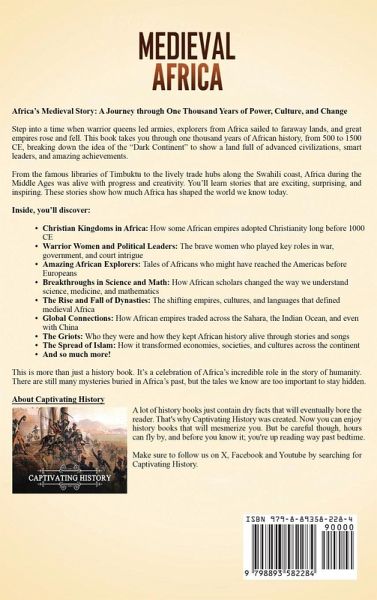 Africa's Medieval Story: A Journey through One Thousand Years of Power, Culture, and Change Step into a time when warrior queens led armies, explorers from Africa sailed to faraway lands, and great empires rose and fell. This book takes you through one thousand years of African history, from 500 to 1500 CE, breaking down the idea of the "Dark Continent" to show a land full of advanced civilizations, smart leaders, and amazing achievements. From the famous libraries of Timbuktu to the lively trade hubs along the Swahili coast, Africa during the Middle Ages was alive with progress and creativity. You'll learn stories that are exciting, surprising, and inspiring. These stories show how much Africa has shaped the world we know today. Inside, you'll discover: Christian Kingdoms in Africa: How some African empires adopted Christianity long before 1000 CE Warrior Women and Political Leaders: The brave women who played key roles in war, government, and court intrigue Amazing African Explorers: Tales of Africans who might have reached the Americas before Europeans Breakthroughs in Science and Math: How African scholars changed the way we understand science, medicine, and mathematics The Rise and Fall of Dynasties: The shifting empires, cultures, and languages that defined medieval Africa Global Connections: How African empires traded across the Sahara, the Indian Ocean, and even with China The Griots: Who they were and how they kept African history alive through stories and songs The Spread of Islam: How it transformed economies, societies, and cultures across the continent And so much more! This is more than just a history book. It's a celebration of Africa's incredible role in the story of humanity. There are still many mysteries buried in Africa's past, but the tales we know are too important to stay hidden.