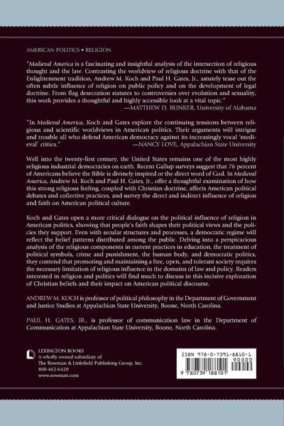 Well into the twenty-first century, the United States remains one of the most highly religious industrial democracies on earth. Recent Gallup surveys suggest that 76 percent of Americans believe that the Bible is divinely inspired or the direct word of God. In Medieval America, Andrew M Koch and Paul H. Gates, Jr. offer a thoughtful examination of how this strong religious feeling, coupled with Christian doctrine, affects American political debates and collective practices and surveying the direct and indirect influence of religion and faith on American political culture. Koch and Gates open a more critical dialogue on the political influence of religion in American politics, showing that people's faith shapes their political views and the policies they support. Even with secular structures and processes, a democratic regime will reflect the belief patterns distributed among the public. Delving into a perspicacious analysis of the religious components in current practices in education, the treatment of political symbols, crime and punishment, the human body, and democratic politics, they contend that promoting and maintaining a free, open, and tolerant society requires the necessary limitation of religious influence in the domains of law and policy. Readers interested in religion and politics will find much to discuss in this incisive exploration of Christian beliefs and their impact on American political discourse.