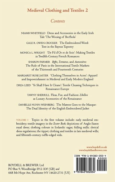 Historical dress and textiles, always a topic of popular interest, has in recent years become an academic subject in its own right, transcending traditional genre boundaries. This annual journal includes in-depth studies from a variety of disciplines as well as cross-genre scholarship, representing such fields as social history, economics, history of techniques and technology, art history, archaeology, literature, and language. The contents cover a broad geographical scope and a range of periods from the early Middle Ages to the Renaissance. Papers in this latest volume discuss clothing descriptions in an early Irish poem in relation to archaeological finds; the Latin inscription embroidered on the Bayeux Tapestry; clothmaking in twelfth-century French romances; medieval Paris as an international textile market; the cost of sartorial excess in England as attested by sumptuary laws and satire; textile cleaning techniques at a German convent in the fifteenth century; the use of jewelled animal pelts as fashion accessories in the Renaissance; and the social significance of the embroidered jacket in early modern England. Also included are reviews of recent books on dress and textile topics. ROBIN NETHERTON's research focuses on medieval Western European clothing and its interpretation by artists and historians; GALE R. OWEN-CROCKER is Professor of Anglo-Saxon Culture, The University of Manchester. Her most recent books are 'Dress in Anglo-Saxon England' (2004), and 'King Harold II and the Bayeux Tapestry'(2005).