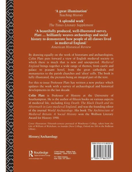 By drawing equally on the work of historians and archaeologists, Colin Platt puts forward a view of English medieval society in which there is much that is new and unexpected. Medieval England brings together a wide range of themes, from castle and palace to peasant hovel, from the great cathedrals and monasteries to the parish churches and `alien' cells. The book is fully illustrated, the pictures being an integral part of the text.For this re-issue Professor Platt has written a new preface which updates the work with a survay of archaeological and historical developments in the last decade.
