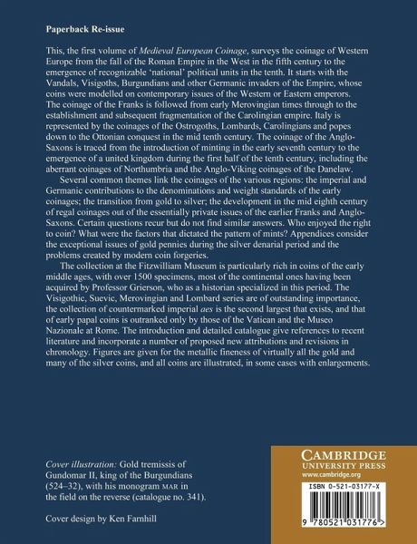This, the first volume of Medieval European Coinage, surveys the coinage of Western Europe from the fall of the Roman Empire in the West in the fifth century to the emergence of recognizable 'national' political units in the tenth. It starts with the Vandals, Visigoths, Burgundians and other Germanic invaders of the Empire, whose coins were modelled on contemporary issues of the Western or Eastern emperors. The coinage of the Franks is followed from early Merovingian times through to the establishment and subsequent fragmentation of the Carolingian empire. Italy is represented by the coinages of the Ostrogoths, Lombards, Carolingians and popes down to the Ottoman conquest in the mid-tenth century. The coinage of the Anglo-Saxons is traced from the introduction of minting in the early seventh century to the emergence of a united kingdom during the first half of the tenth century, including the aberrant coinages of Northumbria and the Anglo-Viking coinages of the Danelaw.