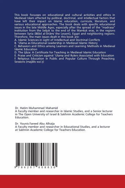 This book focusses on educational and cultural activities and ethics in Medieval Islam affected by political, doctrinal, and intellectual factors that have left their impact on Islamic education, curricula, literature, and various educational approaches. The book deals with specific educational issues in the late Middle Ages, especially after the spread of the "madrasa" institution from the Seljuk to the end of the Mamluk eras, in the regions between Syria (Bilad al-Sham/ the Levant), Egypt and neighboring regions. Therefore, the main issues dealt in this book are:A. Islamic Sciences in Light of Intellectual and Doctrinal ConflictsB. Ulama as Educational Leadership in Medieval Islamic History C. Behaviors and Ethics among Learners and Learning Methods in Medieval Islamic EducationD. The Ijaza: A Certificate for Teaching in Medieval Islamic EducationE. Praise and Criticism against Ulama and Rulers Associated with EducationF. Religious Education in Public and Popular Culture Through Preaching Sessions (majalis wa )