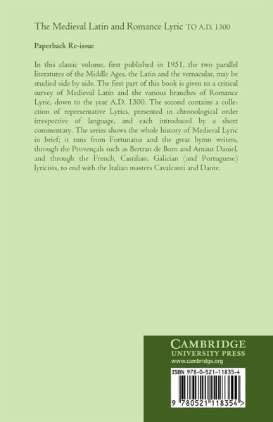 In this classic volume, first published in 1951, the two parallel literatures of the Middle Ages, the Latin and the vernacular, may be studied side by side. The first part of this book is given to a critical survey of medieval Latin and the various branches of Romance Lyric, down to the year AD 1300. The second contains a collection of representative Lyrics, presented in chronological order irrespective of language and each introduced by a short commentary. The series shows the whole history of Medieval Lyric in brief; it runs from Fortunatus and the great hymn writers, through the Provencals such as Bertran de Born and Arnaut Daniel and through the French, Castilian, Galician (and Portuguese) lyricists, to end with the Italian masters Cavalcanti and Dante.