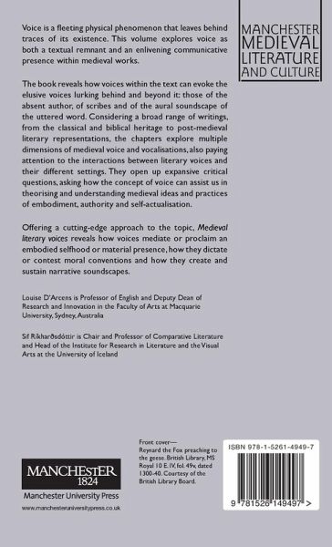Medieval literary voices explores literary voice in relation to its authorial, scribal and socio-political settings. It reveals how literary voices evoke voices lurking beyond the text â the absent authorial voice, the traces of scribal voices and the aural soundscape of the uttered text â and how they mediate embodied life and material presence. -- .