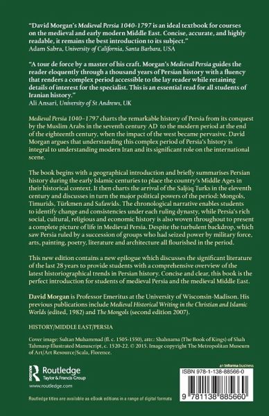 Medieval Persia 1040-1797 charts the remarkable history of Persia from its conquest by the Muslim Arabs in the seventh century AD to the modern period at the end of the eighteenth century, when the impact of the west became pervasive. David Morgan argues that understanding this complex period of Persia's history is integral to understanding modern Iran and its significant role on the international scene.