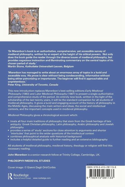 'Professor Marenbon's book is an authoritative, comprehensive, yet accessible survey of medieval philosophy, written by an expert at the height of his critical powers. Not only does the book guide the reader through the diverse issues of medieval philosophy, but provides sagacious instruction and illuminating commentary on the central topics of its chosen period of study.' - Martin Stone, Katholieke Universiteit Leuven, Belgium
