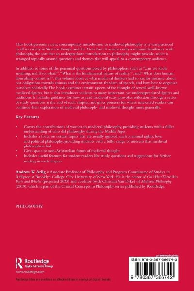 In addition to some of the perennial questions posed by philosophers, such as "Can we know anything, and if so, what?", "What is the fundamental nature of reality?", and "What does human flourishing consist in?", this volume looks at what medieval thinkers had to say, for instance, about our obligations towards animals and the environment, freedom of speech, and how best to organize ourselves politically. The book examines certain aspects of the thought of several well-known medieval figures, but it also introduces students to many important, yet underappreciated figures and traditions.It includes guidance for how to read medieval texts, provokes reflection through a series of study questions at the end of each chapter, and gives pointers for where interested readers can continue their exploration of medieval philosophy and medieval thought more generally.