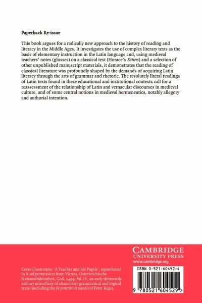 This book argues for a radically new approach to the history of reading and literacy in the Middle Ages. It investigates the use of complex literary texts as the basis of elementary instruction in the Latin language and, using medieval teachers' notes (glosses) on a classical text (Horace's Satires) and a selection of other unpublished manuscript materials, it demonstrates that the reading of classical literature was profoundly shaped by the demands of acquiring Latin literacy through the arts of grammar and rhetoric. The resolutely literal readings of Latin texts found in these educational and institutional contexts call for a reassessment of the relationship of Latin and vernacular discourses in medieval culture, and of some central notions in medieval hermeneutics, notably allegory and authorial intention.