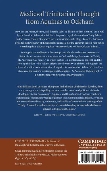 How can the Father, the Son, and the Holy Spirit be distinct and yet identical? Prompted by the doctrine of the divine Trinity, this question sparked centuries of lively debate. In the current context of renewed interest in Trinitarian theology, Russell L. Friedman provides the first survey of the scholastic discussion of the Trinity in the 100-year period stretching from Thomas Aquinas' earliest works to William Ockham's death. Tracing two central issues - the attempt to explain how the three persons are distinct from each other but identical as God, and the application to the Trinity of a 'psychological model', on which the Son is a mental word or concept, and the Holy Spirit is love - this volume offers a broad overview of Trinitarian thought in the thirteenth and fourteenth centuries, along with focused studies of the Trinitarian ideas of many of the period's most important theologians.