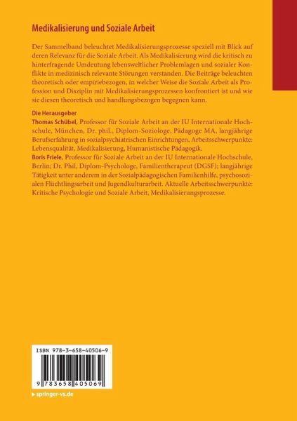 Thomas Schübel, Professor für Soziale Arbeit an der IU Internationale Hochschule, München, Dr. phil., Diplom-Soziologe, Pädagoge MA, langjährige Berufserfahrung in sozialpsychiatrischen Einrichtungen, Arbeitsschwerpunkte: Lebensqualität, Medikalisierung, Humanistische Pädagogik. Boris Friele, Professor für Soziale Arbeit an der IU Internationale Hochschule, Berlin; Dr. Phil, Diplom-Psychologe, Familientherapeut (DGSF); langjährige Tätigkeit unter anderem in der Sozialpädagogischen Familienhilfe, psychosozialen Flüchtlingsarbeit und Jugendkulturarbeit. Aktuelle Arbeitsschwerpunkte: Kritische Psychologie und Soziale Arbeit, Medikalisierungsprozesse.