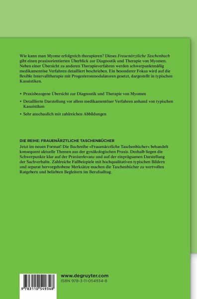 Dieses Frauenärztlichen Taschenbuch gibt eine Übersicht zur Diagnostik und Therapie von Myomen. Neben epidemiologischen Daten erfolgt die Darstellung wesentlicher diagnostischer Methoden mit Bildmaterial.