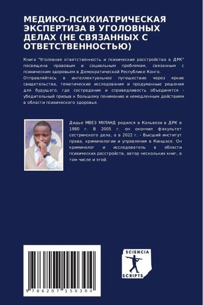 Kniga "Ugolownaq otwetstwennost' i psihicheskie rasstrojstwa w DRK" poswqschena prawowym i social'nym problemam, swqzannym s psihicheskim zdorow'em w Demokraticheskoj Respublike Kongo.Otprawlqjtes' w intellektual'noe puteshestwie cherez qrkie swidetel'stwa, tematicheskie issledowaniq i produmannye resheniq dlq buduschego, gde sostradanie i sprawedliwost' ob#edinqtsq - ubeditel'nyj prizyw k bol'shemu ponimaniü i nemedlennym dejstwiqm w oblasti psihicheskogo zdorow'q.
