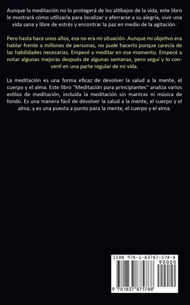 Aunque la meditación no lo protegerá de los altibajos de la vida, este libro le mostrará cómo utilizarla para localizar y aferrarse a su alegría, vivir una vida sana y libre de estrés y encontrar la paz en medio de la agitación. Pero hasta hace unos años, esa no era mi situación. Aunque mi objetivo era hablar frente a millones de personas, no pude hacerlo porque carecía de las habilidades necesarias. Empecé a meditar en ese momento. Empecé a notar algunas mejoras después de algunas semanas, pero seguí y lo convertí en una parte regular de mi vida. La meditación es una forma eficaz de devolver la salud a la mente, el cuerpo y el alma. Este libro "Meditación para principiantes" analiza varios estilos de meditación, incluida la meditación sin mantras ni música de fondo. Es una manera fácil de devolver la salud a la mente, el cuerpo y el alma, y es una puesta a punto para la mente, el cuerpo y el alma.