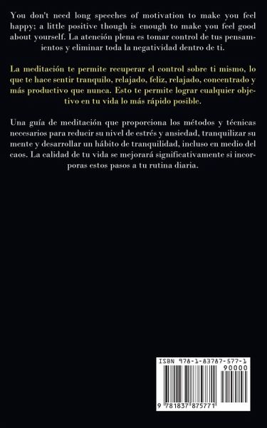 You don't need long speeches of motivation to make you feel happy; a little positive though is enough to make you feel good about yourself. La atención plena es tomar control de tus pensamientos y eliminar toda la negatividad dentro de ti. La meditación te permite recuperar el control sobre ti mismo, lo que te hace sentir tranquilo, relajado, feliz, relajado, concentrado y más productivo que nunca. Esto te permite lograr cualquier objetivo en tu vida lo más rápido posible. Una guía de meditación que proporciona los métodos y técnicas necesarios para reducir su nivel de estrés y ansiedad, tranquilizar su mente y desarrollar un hábito de tranquilidad, incluso en medio del caos. La calidad de tu vida se mejorará significativamente si incorporas estos pasos a tu rutina diaria.