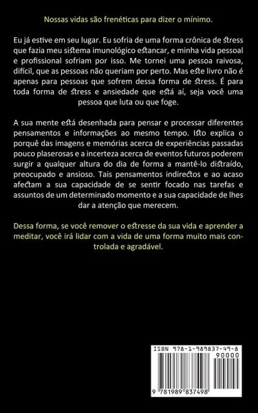 Nossas vidas são frenéticas para dizer o mínimo. Eu já estive em seu lugar. Eu sofria de uma forma crônica de stress que fazia meu sistema imunológico estancar, e minha vida pessoal e profissional sofriam por isso. Me tornei uma pessoa raivosa, difícil, que as pessoas não queriam por perto. Mas este livro não é apenas para pessoas que sofrem dessa forma de stress. É para toda forma de stress e ansiedade que está aí, seja você uma pessoa que luta ou que foge. A sua mente está desenhada para pensar e processar diferentes pensamentos e informações ao mesmo tempo. Isto explica o porquê das imagens e memórias acerca de experiências passadas pouco plaserosas e a incerteza acerca de eventos futuros poderem surgir a qualquer altura do dia de forma a mantê-lo distraído, preocupado e ansioso. Tais pensamentos indirectos e ao acaso afectam a sua capacidade de se sentir focado nas tarefas e assuntos de um determinado momento e a sua capacidade de lhes dar a atenção que merecem. Dessa forma, se você remover o estresse da sua vida e aprender a meditar, você irá lidar com a vida de uma forma muito mais controlada e agradável.