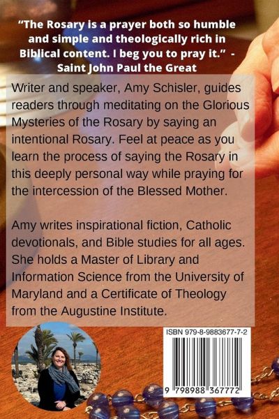 Writer and speaker, Amy Schisler, guides readers through meditating on the Glorious Mysteries of the Rosary by saying an intentional Rosary. Feel at peace as you learn the process of saying the Rosary in this deeply personal way while praying for the intercession of the Blessed Mother. Amy writes inspirational fiction, Catholic devotionals, and Bible studies for all ages. She holds a Master of Library and Information Science from the University of Maryland and a Certificate of Theology from the Augustine Institute.