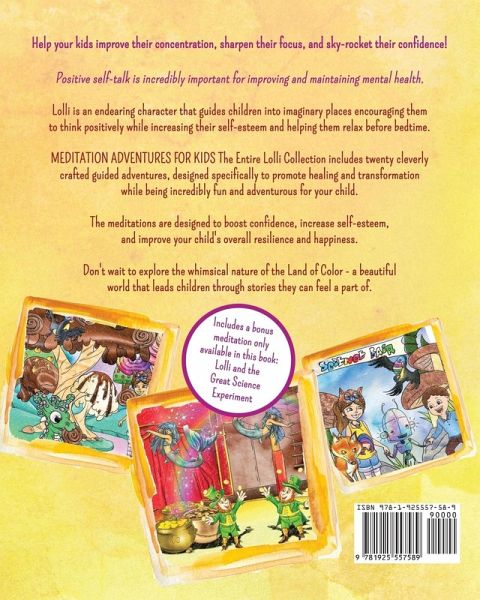 Help your kids improve their concentration, sharpen their focus and sky-rocket their confidence! Positive self-talk is incredibly important for improving and maintaining mental health. Lolli is an endearing character that guides children into imaginary places encouraging them to think positively while increasing their self-esteem and helping them relax before bedtime. MEDITATION ADVENTURES FOR KIDS The Entire Collection includes twenty cleverly crafted guided adventures, designed specifically to promote healing and transformation while being incredibly fun and adventurous for your child. The meditations are designed to boost confidence, increase self-esteem, and improve your child's overall resilience and happiness. Don’t wait to explore the whimsical nature of the Land of Color - a beautiful world that leads children through stories they can feel a part of. BUY IT NOW!
