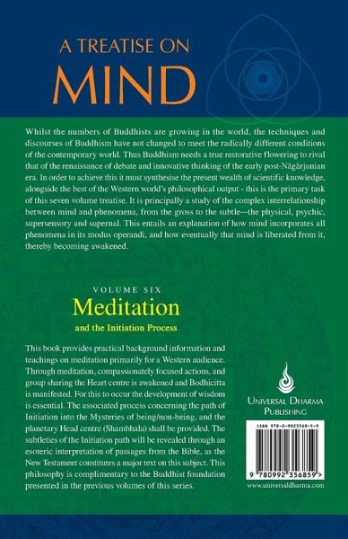 This book provides practical background information and teachings on meditation primarily for a Western audience. Through meditation, compassionately focused actions, and group sharing the Heart centre is awakened and Bodhicitta is manifested. For this to occur the development of wisdom is essential. The associated process concerning the path of Initiation into the Mysteries of being/non-being, and the planetary Head centre (Shambhala) shall be provided. The subtleties of the Initiation path will be revealed through an esoteric interpretation of passages from the Bible, as the New Testament constitutes a major text on this subject. This philosophy is complimentary to the Buddhist foundation presented in the previous volumes of this series. A Treatise on Mind Outline Volume 1 The "Self" or "Non-self" in Buddhism Volume 2 Considerations of Mind-A Buddhist Enquiry Volume 3 The Buddha-Womb and the Way to Liberation Volume 4 Mandalas: Their Nature and Development Volume 5 An Esoteric Exposition of the Bardo Thödol Volume 6 Meditation and the Initiation Process Volume 7 The Constitution of Shambhala Whilst the numbers of Buddhists are growing in the world, the techniques and discourses of Buddhism have not changed to meet the radically different conditions of the contemporary world. Thus Buddhism needs a true restorative flowering to rival that of the renaissance of debate and innovative thinking of the early post-N¿g¿rjunian era. In order to achieve this it must synthesise the present wealth of scientific knowledge, alongside the best of the Western world's philosophical output - this is the primary task of this seven volume treatise. It is principally a study of the complex interrelationship between mind and phenomena, from the gross to the subtle-the physical, psychic, supersensory and supernal. This entails an explanation of how mind incorporates all phenomena in its modus operandi, and how eventually that mind is liberated from it, thereby becoming awakened.