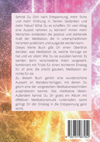 Es ist unumstritten, dass sich Meditation und Meditieren positiv auf Körper, Geist und Seele auswirken. Meditation kann dazu beitragen, das Chaos im Kopf zu klären, sich zu entspannen und gesünder zu fühlen und den Fokus zu behalten. Aber wie schafft man es als Anfänger oder Skeptiker, sich auf die altbewährte Methode der Entspannung einzulassen? Autorin Sia Westphal macht es Anfängern und kritischen Einsteigern leicht, Meditation und Meditieren kennen zu lernen: In ihrem sympathischen Ratgeber-Buch erklärt sie, wie sich Meditation auf uns auswirkt und vor allem, wie man als Anfänger leicht in diese Entspannungstechnik einsteigen kann. Sie stellt verschiedene Meditationsmethoden vor, gibt Tipps und Anregungen. Als Bonus enthält "Meditation - Entspannung & Fokus" ein Mandala-Malbuch für Erwachsene zum Ausmalen. Mit den Vorlagen kann die Mal-Meditation gleich ausprobiert werden. Das Buch beinhaltet zudem einen Downloadlink, über den sich ein wunderbares Gratis-Album mit hochwertiger Meditationsmusik herunterladen lässt.