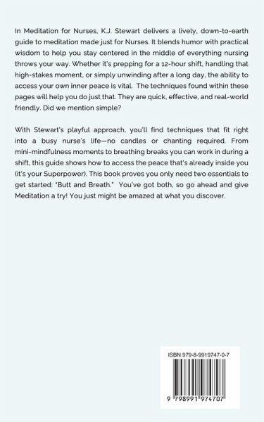 In Meditation for Nurses, K.J. Stewart delivers a lively, down-to-earth guide to meditation made just for Nurses. It blends humor with practical wisdom to help you stay centered in the middle of everything nursing throws your way. Whether it's prepping for a 12-hour shift, handling that high-stakes moment, or simply unwinding after a long day, the ability to access your own inner peace is vital. The techniques found within these pages will help you do just that. They are quick, effective, and real-world friendly. Did we mention simple? With Stewart's playful approach, you'll find techniques that fit right into a busy nurse's life-no candles or chanting required. From mini-mindfulness moments to breathing breaks you can work in during a shift, this guide shows how to access the peace that's already inside you (it's your Superpower). This book proves you only need two essentials to get started: "Butt and Breath." You've got both, so go ahead and give Meditation a try! You just might be amazed at what you discover.