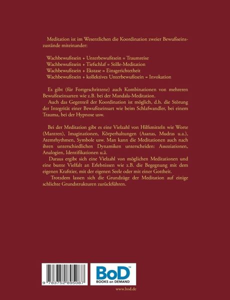 Meditation ist im Wesentlichen die Koordination zweier Bewußtseinszustände miteinander:Wachbewußtsein + Unterbewußtsein = TraumreiseWachbewußtsein + Tiefschlaf = Stille-MeditationWachbewußtsein + Ekstase = EinsgerichtetheitWachbewußtsein + kollektives Unterbewußtsein = InvokationEs gibt (für Fortgeschrittene) auch Kombinationen von mehreren Bewußtseinsarten wie z.B. bei der Mandala-Meditation.Es gibt auch das Gegenteil der Koordination, d.h. die Störung der Integrität einer Bewußtseinsart wie beim Schlafwandler, bei einem Trauma, bei der Hypnose usw.Bei der Meditation gibt es eine Vielzahl von Hilfsmitteln wie Worte (Mantren), Imaginationen, Körperhaltungen (Asanas, Mudras u.a.), Atemrhythmen, Symbole usw. Es gibt auch unterschiedliche Dynamiken wie Assoziationen, Analogien, Identifikationen u.ä.Daraus ergibt sich eine Vielzahl von möglichen Meditationen und eine bunte Vielfalt an möglichen Erlebnissen wie z.B. die Begegnung mit dem eigenen Krafttier, mit der eigenen Seele oder mit einer Gottheit.Trotzdem lassen sich die Grundzüge der Meditation auf einige schlichte Grundstrukturen zurückführen.