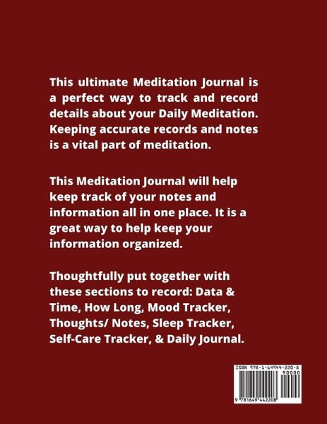 This beautiful Meditation Journal is a great tool that can help you in tracking your meditations, your meditation goals, and help you see patterns. Meditating can help you reduce your anxiety and stress, and can help you increase your gratitude, your productivity, your creativity, and positivity. Each inside interior page has a space to record the following: Date & Time - Write the time, month, day, and year. How Long - Log how long you meditated. Mood Tracker - Record how you felt before & after meditation, good, neutral, or stressed. Thoughts/ Notes - Write any specific thoughts that came to mind while meditating. Sleep Tracker - Log sleep quality, hours you slept, what time you went to bed, & dream notes. Self Care Tracker - Record your mind and spirit health at the moment, along with any physical activity or exercise. Daily Journal - Write any other important detail about your day that you like, such as your main focus, positive affirmations, personal thoughts, inspirational quotes, creative ideas, goals, special prayer for the day, etc. Journaling your meditations is a perfect way to work through any struggles you may have. Will also make a great gift. Great to look back on and reflect and keep track of your meditations. Journal your way to a better you! Simple and easy to use. Get your copy now! Size is 8.5x11 inches, 102 pages, soft matte finish cover, black ink, white paper, paperback.