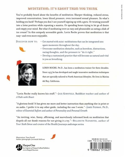 You′ve probably heard about the benefits of meditation: Sharper thinking, reduced stress, improved concentration, lower blood pressure, even increased sexual pleasure , all of these positive effects have been confirmed by science. In this uniquely accessible guide, Lorin Roche shows that meditation is that easy , and pleasurable. Roche answers questions and debunks meditation myths, and gives three easy-to-follow techniques for getting started 塴he Do Nothing Technique," "Salute Each of the Senses," and "Feeling at Home Exercise". He and shows you how to integrate "mini meditations" into spare moments of the day, from savouring morning coffee to taking advantage of the five minutes before a meeting. He explains how to overcome meditation obstacles, customise meditation to your own needs, and use your breath, voice, and attention as meditation aids. And he shows how meditation will give you the power to explore your inner passions , and enrich your sense of self.