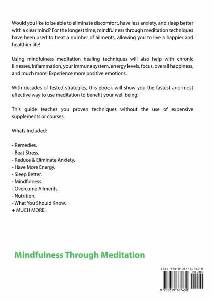 Would you like to be able to eliminate discomfort, have less anxiety, sleep better with a clear mind, and beat depression? For the longest time, mindfulness through meditation techniques have been used to treat a number of ailments, allowing you to live a happier and healthier life! Using meditation healing techniques will also help with chronic illnesses, inflammation, your immune system, energy levels, focus, overall happiness, and much more! Experience more positive emotions and less depression. Introducing the secrets natural healing professionals use to feel healthier than ever before! With decades of tested strategies, this ebook will show you the fastest and most effective way to use meditation to benefit your well being! This guide teaches you proven techniques without the use of expensive supplements or courses. Whats Included: - Beat Depression. - Remedies. - Beat Stress. - Reduce & Eliminate Anxiety. - Have More Energy. - Sleep Better. - Mindfulness. - Overcome Ailments. - Nutrition. - What You Should Know. + MUCH MORE! If you want to be healthier, cure ailments, or improve focus & well-being then this guide is for you. --> Scroll to the top of the page and click add to cart to purchase instantly <-- Disclaimer: This author and or rights owner(s) make no claims, promises, or guarantees in regards to the accuracy, completeness, or adequacy of the contents of this book, and expressly disclaims liability for errors and omissions in the contents within. This product is for reference use only. Please consult a professional before taking action on any of the contents found within.