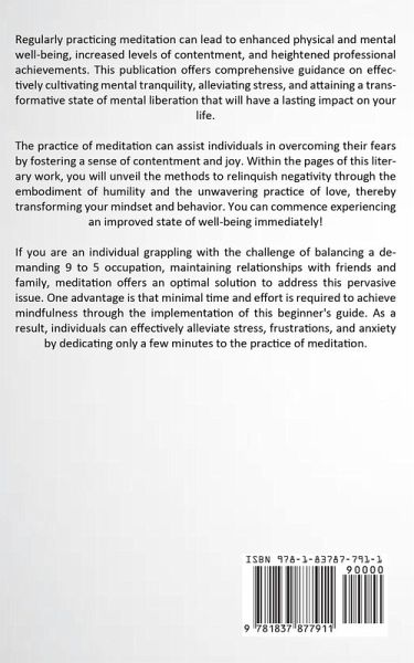 Regularly practicing meditation can lead to enhanced physical and mental well-being, increased levels of contentment, and heightened professional achievements. This publication offers comprehensive guidance on effectively cultivating mental tranquility, alleviating stress, and attaining a transformative state of mental liberation that will have a lasting impact on your life. The practice of meditation can assist individuals in overcoming their fears by fostering a sense of contentment and joy. Within the pages of this literary work, you will unveil the methods to relinquish negativity through the embodiment of humility and the unwavering practice of love, thereby transforming your mindset and behavior. You can commence experiencing an improved state of well-being immediately! If you are an individual grappling with the challenge of balancing a demanding 9 to 5 occupation, maintaining relationships with friends and family, meditation offers an optimal solution to address this pervasive issue. One advantage is that minimal time and effort is required to achieve mindfulness through the implementation of this beginner's guide. As a result, individuals can effectively alleviate stress, frustrations, and anxiety by dedicating only a few minutes to the practice of meditation.