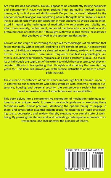 Are you stressed constantly? Do you appear to be consistently lacking happiness and contentment? Have you been seeking inner tranquility through external means, only to find yourself disillusioned? Do you find yourself fatigued by the phenomenon of having an overwhelming influx of thoughts simultaneously, resulting in a lack of lucidity and concentration in your endeavors? Would you be interested in learning the techniques of meditation to rejuvenate your vitality and attain inner serenity, contentment, enhanced mental acuity, concentration, and a profound sense of satisfaction? If this aligns with your search criteria, rest assured that you have arrived at the appropriate destination. You are on the verge of uncovering the age-old methodologies of meditation that foster tranquility within oneself, leading to a life devoid of stress. A considerable number of individuals experience elevated levels of stress, anxiety, and cognitive distress on a daily basis. These issues frequently manifest as physiological ailments, including hypertension, migraines, and even persistent illness. The majority of individuals are cognizant of the extent to which they bear stress, yet they encounter difficulty in tranquilizing their thoughts and attaining the serenity they yearn for. This book will provide you with precise instructions on how to accomplish that task. The current circumstances of our existence impose significant demands upon us. In contrast to our predecessors who solely grappled with concerns regarding sustenance, housing, and personal security, the contemporary society has engendered successive strata of expectations and responsibilities. This book delves into a comprehensive exploration of meditation techniques tailored to your unique needs. It presents invaluable guidance on executing these techniques with utmost precision, identifying the optimal timing to engage in them, and covers other essential insights crucial for fostering self-care by alleviating stress, depression, and anxiety, thereby elevating your overall state of well-being. By perusing this literary work and dedicating contemplative moments to introspection, one shall uncover the pinnacle of felicity.