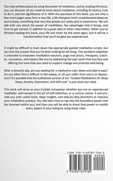 You may achieve peace by using the power of mediation, and by reading this book, you can discover all you need to know about mediation, including its history, how to do it, and the significance of it. With the purchase of this book, you are only a few short pages away from a new life, a life that gives forth unadulterated pleasure and ecstasy, something that very few people are really able to experience. We will talk with you about the power of meditation, the advantages that it brings, and how to get started, in addition to a great deal of other information. When you've finished reading this book, your life will never be the same again, but it will be a transformation that you'll be glad you experienced. It might be difficult to track down the appropriate guided meditation scripts, but we have the answer that you've been looking for all along. This excellent collection is intended to empower meditation teachers, yoga instructors, therapists, coaches, counselors, and healers like you by addressing the pain spots that you face and offering the tools that you need to support change and promote well-being. After a stressful day, are you seeking for a method to calm down and take it easy? Do you often find it difficult to fall asleep, or do you suffer from worry or depression? It's possible that the audiobook version of our "Guided Meditations for Deep Sleep, Anxiety, Depression, and Self-Love" is just what you need. This book will serve as your trusted companion whether you are an experienced meditator, well-versed in the art of self-reflection, or a curious novice. It will provide you with useful tools, deep insights, and step-by-step directions to improve your meditation practice. You will learn how to tap into the boundless power that lies dormant within you, and then you will be able to direct that power to modify every aspect of your being by using these rules.
