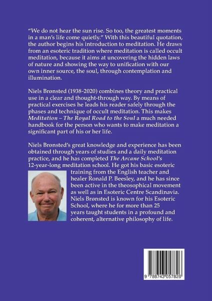 "We do not hear the sun rise. So too, the greatest moments in a man's life come quietly." With this beautiful quotation, the author begins his introduction to meditation. He draws from an esoteric tradition where meditation is called occult meditation, because it aims at uncovering the hidden laws of nature and showing the way to unification with our own inner source, the soul, through contemplation and illumination. Niels Brønsted (1938-2020) combines theory and practical use in a clear and thought-through way. By means of practical exercises he leads his reader safely through the phases and technique of occult meditation. This makes Meditation - The Royal Road to the Soul a much needed handbook for the person who wants to make meditation a significant part of his or her life.