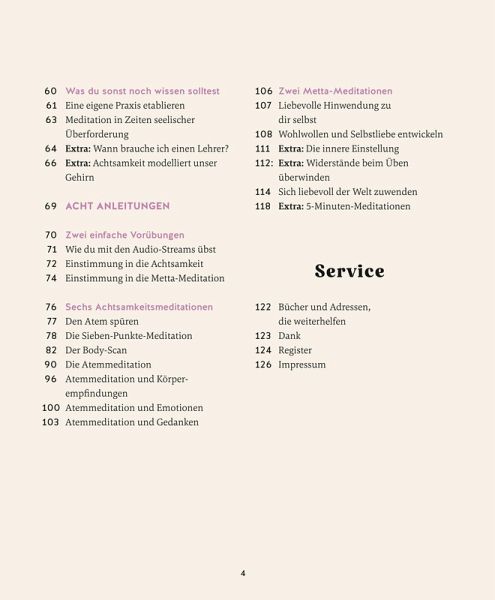 Hinweis zur OptimierungImpressumWichtiger HinweisDieses Buch ist das richtige für dich, wenn ...Marie MannschatzVorwortDie Kraft der MeditationMeditieren lernenAcht AnleitungenBücher und Adressen, die weiterhelfenDankSo verbessert Meditation dein LebenKurzes InnehaltenDie Übungsprogramme - dein Weg zu mehr Fokus und BalanceWie du mit Meditation beginnstZur Autorin