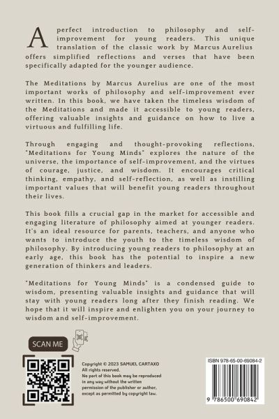 Unlock the Wisdom of the Ages with "Meditations for Young Minds"! Discover the wisdom of one of the greatest philosophers of all time with "Meditations for Young Minds: A Condensed Guide to Wisdom." This unique book is a special adaptation of the classic work by Marcus Aurelius, offering simplified reflections and verses that have been specifically adapted for younger readers. The Meditations by Marcus Aurelius is one of the most important works of philosophy and self-improvement ever written. It has been studied and admired for centuries and continues to be a source of inspiration for millions of people around the world. Now, with "Meditations for Young Minds," young readers can discover the timeless wisdom of Marcus Aurelius in a way that is accessible, engaging, and easy to understand. Through engaging and thought-provoking reflections, "Meditations for Young Minds" explores the nature of the universe, the importance of self-improvement, and the virtues of courage, justice, and wisdom. It offers valuable insights and guidance on how to live a virtuous and fulfilling life, instilling important values that will benefit young readers throughout their lives. This book fills a crucial gap in the market for accessible and engaging works of philosophy aimed at younger readers. It's an ideal resource for parents, teachers, and anyone who wants to introduce the youth to the timeless wisdom of philosophy. By introducing young readers to philosophy at an early age, this book has the potential to inspire a new generation of thinkers and leaders. "Meditations for Young Minds" is a condensed guide to wisdom, offering valuable insights and guidance that will stay with young readers long after they finish reading. It's an essential addition to any young person's library, and a wonderful gift for anyone who wants to inspire a love of philosophy and self-improvement in the next generation.