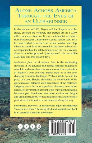 In the summer of 1980, 34-year-old Jim Shapiro laced his shoes, checked the weather, and started off on a 3,000-mile run across America. It was a minimalist adventure: from Dillon Beach, California to Central Park in New York, he carried what he needed, ate when possible, and slept where he could. Save for a stretch in the desert where a car accompanied him for safety, Shapiro ran the route entirely alone as a self-supported "journeyman." His incredible 3,026-mile solo trek took 80 days. Meditations from the Breakdown Lane is the captivating chronicle of the physical and mental fortitude required to complete such an arduous journey, as much an exploration of Shapiro’s own evolving mental state as of the ever-changing American landscape. With an astute eye and the prose of a poet, Shapiro chronicles the vivid details of his epic endeavor, balanced with his analysis of the challenge. Stripping away the most superficial elements, he captures an honest, unvarnished account of his enjoyment, suffering, boredom, pain, loneliness, frustration, elation, and fatigue and ultimate triumph. With candid sincerity, Shapiro offers portraits of the America he encountered along the way. For runners, travelers, or anyone who enjoys the challenge ‘because it is there,’ this insightful and inspirational book is an essential American travelogue.