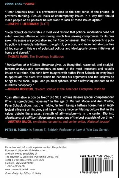 Vital center. Radical middle. Amid the red state/blue state divide, is there now space for an iconoclastic militant moderate? In this unusual and remarkably readable collection of short essays on a wide variety of hot-button public issues-race, affirmative action, surrogate motherhood, diversity, immigration, compensation of 9/11 victims, exclusion of gays from the Boy Scouts and the military, the 2004 election, the rule of law in developing countries, the invasion of Iraq, and many more-Yale Law School professor Peter Schuck reveals the distinctive sensibility and policy orientation of a militant moderate: pragmatic, reformist, non-ideological, empirically-minded, and skeptical of many liberal and conservative pieties.