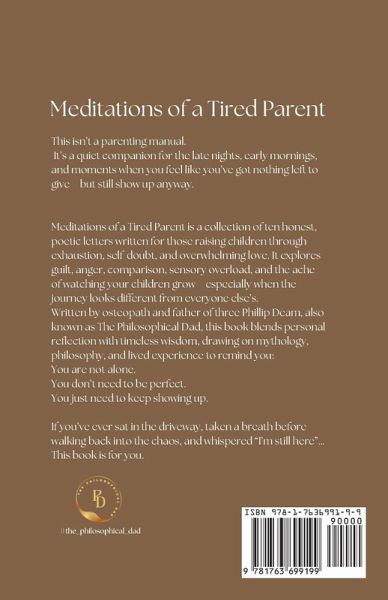 This isn't a parenting manual It's a quiet companion for the late nights, early mornings, and moments when you feel like you've got nothing left to give - but show up anyway. Meditations of a Tired Parent is a collection of ten honest, poetic letters written for those raising children through exhaustion, self-doubt and overwhelming love. It explores guilt, anger, comparison, sensory overload, and the ache of watching children grow - especially when the journey looks so different from everyone else's. Written by osteopath and father of three Dr Phillip Deam (Ost) also known as the philosophical dad, this book blends personal reflection with timeless wisdom, drawing on mythology, philosophy and lived experience to remind you: You are not alone. You don't need to be perfect. You just need to keep showing up. If you ever just sat in the driveway and take a few breaths before walking back inside into the chaos, and whispered "I'm still here" This book is for you